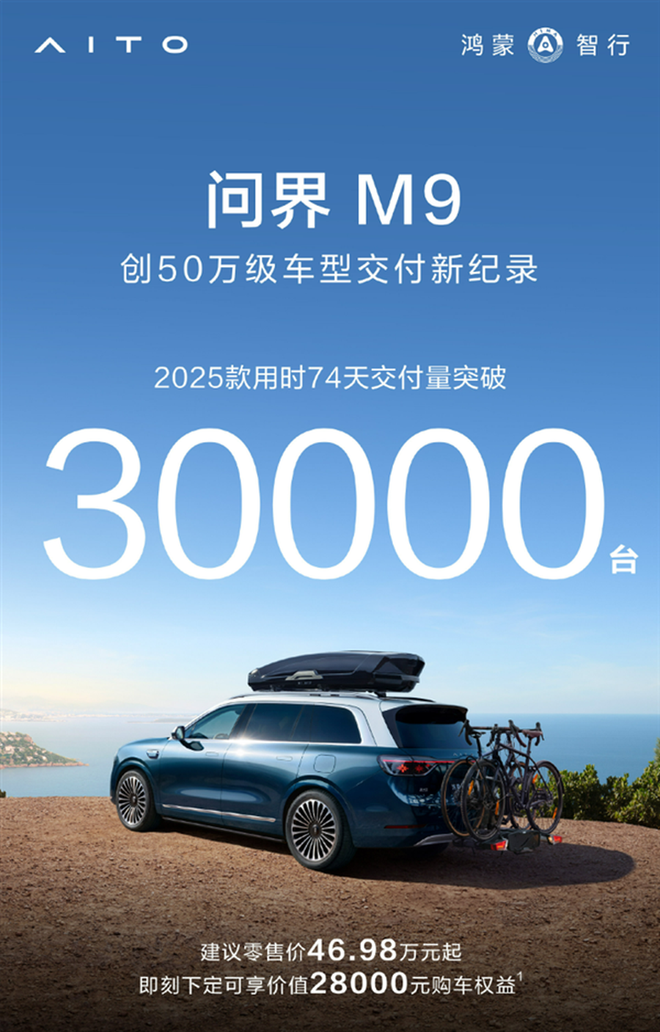 新款问界M9豪车交付量突破3万辆,均价超过60万,这一成绩让奔驰和宝马感到惊讶,这款豪华车型在市场上表现出色,得到了消费者的热烈追捧。