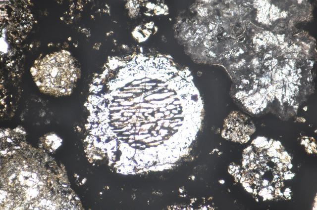 显微镜下,阿连德陨石薄片上可见圆形球粒。图片来源:京都大学三宅彰