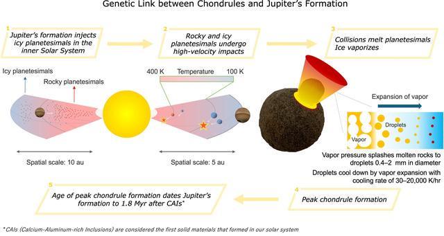“当行星相互碰撞时,水瞬间蒸发成膨胀的蒸汽。这就像微型爆炸一样,将熔融的硅酸盐岩石分解成我们今天在陨石中看到的微小液滴,”该研究的共同第一作者、名古屋大学地球与环境科学研究生院的Sin-iti Sirono教授解释道。“以前的形成理论无法解释球粒的特征,除非需要非常特殊的条件,而这个模型需要木星诞生时早期太阳系中自然发生的条件。”