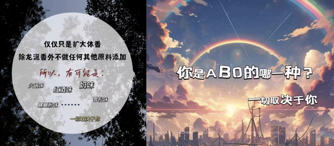 要我说,这些吐槽还是说早了,当信息素香水终于套上命运般的ABO世界观,你才知道啥叫会搞噱头——前辈们一味拿消费者对彰显独特个性的执念做文章,而叠上ABO这重亚文化buff的信息素香水,还拿捏了大家对群体认同的依赖。
