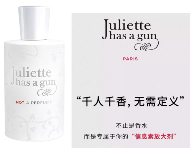法国沙龙香品牌佩枪朱丽叶,2010年推出一款“非香水”(Not A Perfume),卖点就是“千人千香”,号称是“专属于你的信息素放大剂”。2020年佩枪朱丽叶进入中国市场,“非香水”被品牌选为当家花旦重点宣传,并成功吸引了关注,成为很多人知道佩枪朱丽叶的起点。