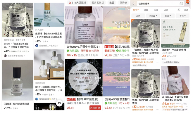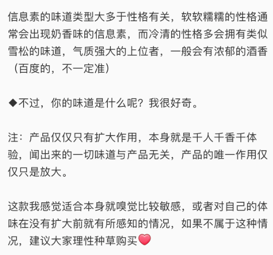 不同于等闲香水要写出800字小作文从前调、中调、后调、灵感来源、研发故事等等角度赏析其香气之底蕴深厚、回味悠长,信息素香水的详情页对ABO的科普都多过对香水的介绍,强调“仅扩大体味”的免责声明都长过对创作过程的披露。