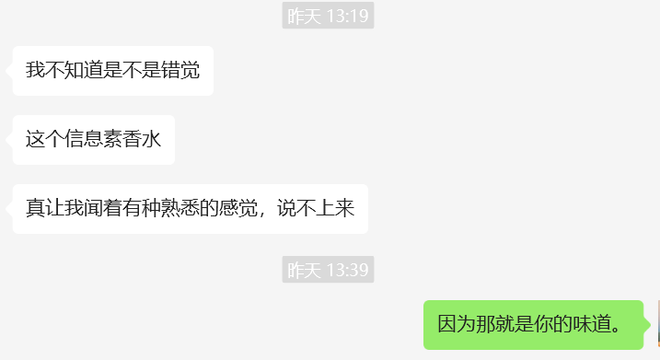 有人发现自己和对象的信息素十分般配:“我刚喷上是茉莉香,静置一会儿又像雨后青草的味道,应该是小O吧;男朋友的信息素是木质香加皮革味,还有一点烟草的气息,包是猛A的。”