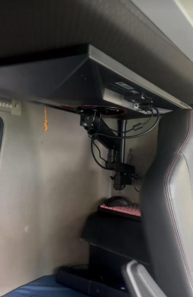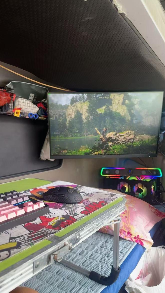 “就家用电脑显示器,固定在车卧铺,电的话,用车上的电瓶,再用设备转接,网就是随身WIFI,电脑不用的时候可以收起来。”李先生称,电瓶够用可以带动电脑,自己只在停车休息时间玩,不会影响行车安全。