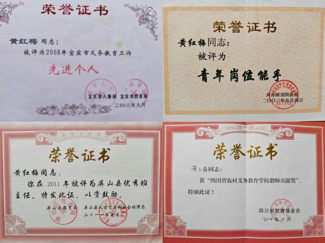 黄红梅32载辛勤耕耘,换来桃李满园、硕果累累。她所带班级的重点高中升学率长期名列全县前茅,曾52次荣获县级教学一等奖,先后被评为宜宾市“优秀少先队大队辅导员”、宜宾市“义务教育工作先进个人”,荣获四川省“农村义务教育学校教师贡献奖”、四川省“优秀乡村教师”等称号。