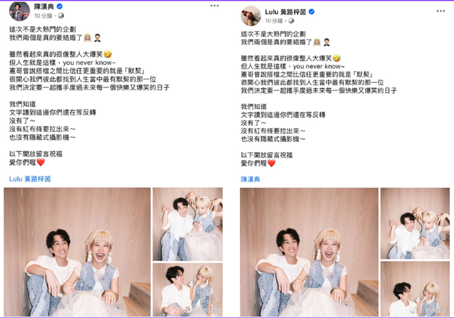 二人在社交平台晒出合照并表示:“这次不是大热门的企划,我们两个是真的要结婚了,虽然看起来真的很像整人大爆笑,但人生就是这样,世事难料。”