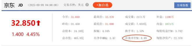 目前京东的市盈率为8.69倍,这个市盈率在电商行业中明显偏低。阿里同期市盈率为16.52倍,拼多多为13.07倍,美团则高达19.29倍。投资人史保刚表示,京东市盈率低于部分同业,显示市场对其盈利增长预期保守,同时京东的市净率2023年触及5年低点2.0x,虽2024年回升至2.3x,但仍低于2020年峰值7.3x,这反映出京东资产估值承压。