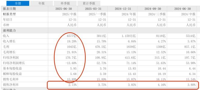 今年上半年京东营收6577亿元,同比增长19.28%;170.7亿元的净利润则同比下滑了13.68%。15.89%的毛利率相比去年同期的15.54%提升了0.35个百分点,2.73%的净利率却相比去年同期的3.80%下降了1.07个百分点,这对营收体量巨大的京东来说不是好消息。