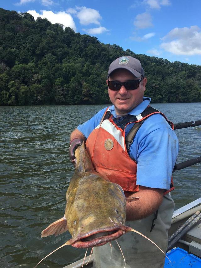 研究合著者、宾夕法尼亚州渔业与船舶委员会苏斯奎哈纳河生物学家杰弗里·史密斯手持一条铲鮰。图片来源:宾夕法尼亚州立大学