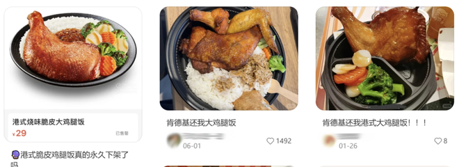 肯德基从进入国内就开始推出盖浇饭,但几乎每一种饭都没有进入常驻菜单,因此饭总是在下架,总是在被追忆:巧手麻婆鸡肉饭、培根蘑菇鸡肉饭、意式萃蔬烤鸡腿饭、黄金鸡柳滑蛋饭。其中最为传奇的,当属肯德基的港式脆皮大鸡腿饭(简称“大鸡腿饭”)。