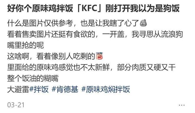 但肯德基翻车的案例也不是没有,比如去年12月推出的吮指原味鸡拌饭。
