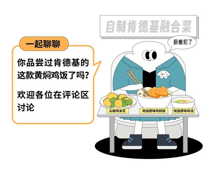 你会发现,肯德基的盖浇饭实质上是把炸鸡变换形态混合进米饭里。而这样的食谱相当省时省力。于是,早在肯德基自己意识到之前,肯德基饭就已经不只是一种米饭产品了,它是一种烹饪方式,继而又是一种生活方式。