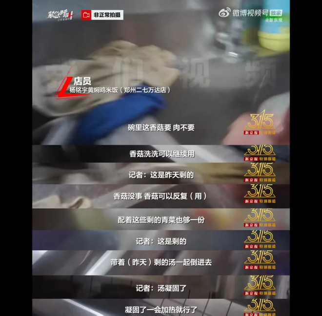 杨铭宇黄焖鸡门店被曝冷藏鸡肉过期、操作间卫生不达标、肉类来源不明、使用变质食材等多项食品安全问题。把剩菜回收卖给顾客或许只是恶心,但你发现黄焖鸡真的威胁到了你的生命安全:存放多天的发酸食材、未做保温措施存放的隔夜鸡肉在处理后再度使用,用色素掩盖变黑食材。一些门店为了降低成本,甚至从非正规渠道采购冻肉,使用“边角料”冒充鸡肉块。