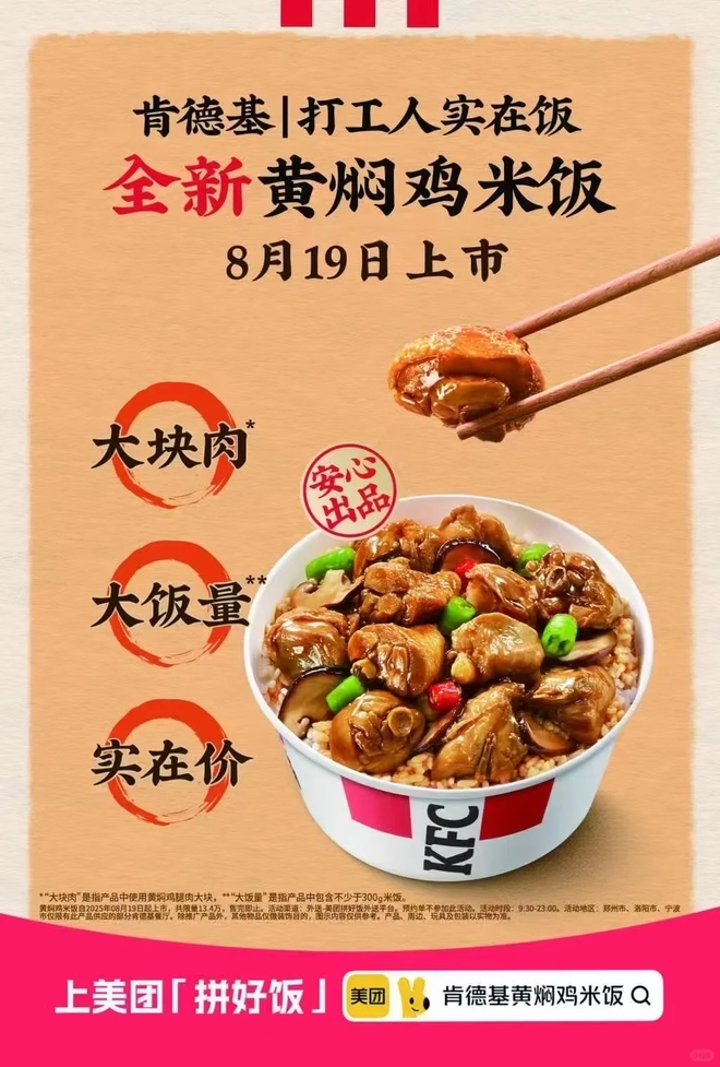 你对一份黄焖鸡的要求也基本是人类谋生的底线了,肯德基也直接明了地写出自家黄焖鸡的“打工人实在饭”定位,以及三大卖点:
