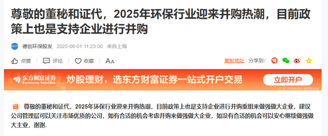 在收购消息披露前,已有投资者在互动易平台对德创环保提出建议——2025年环保行业迎来并购热潮,目前政策上也是支持企业进行并购重组来做强做大企业,建议公司管理层可以关注市场优质的公司,如有合适的机会考虑并购来做强做大企业。
