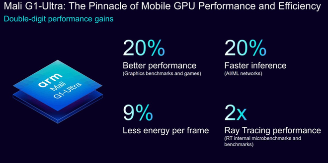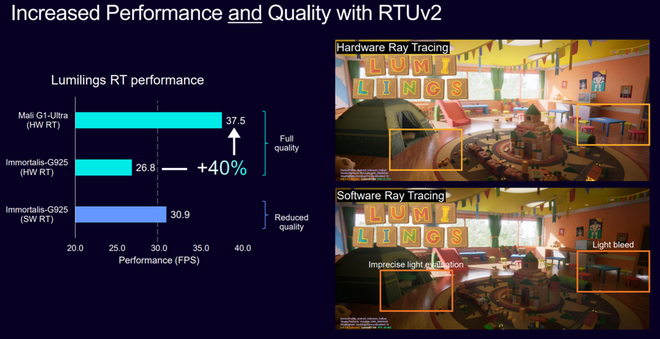 Arm Lumex CSS还包括全新Mali G1-Ultra GPU,这是Arm迄今为止性能最强的移动GPU。其最大亮点是搭载新一代光线追踪单元RTUv2,光线追踪性能提升2倍,在移动端即可实现“桌面级”游戏画质。