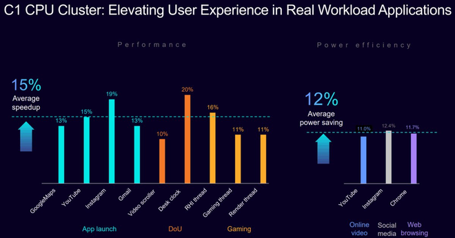 Arm C1 CPU集群在实际用例中表现突出。在行业领先的性能基准测试中,该CPU集群在同等条件下,相较于上一代CPU集群性能平均提升30%,在游戏和视频流媒体等应用中平均提速15%。与此同时,在日常移动端工作负载(如视频播放、社交媒体、网页浏览)中,该CPU集群在同等条件下,相较于上一代CPU集群功耗平均降低12%。
