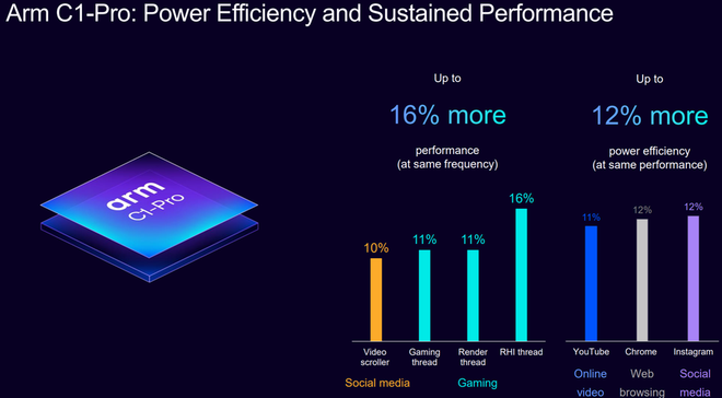 Arm C1-Pro:高能效核心,在相同频率下持续性能提升 16%,视频播放、网页浏览及社交媒体等日常应用能效提升多达 12%;