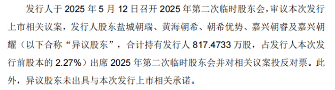 然而,在推进上市时,麦田能源却意外遭遇股东"叫板"。招股书显示,麦田能源于5月12日召开2025年第二次临时股东会,审议本次发行上市相关议案,股东盐城朝瑞、黄海朝希、朝希优势、嘉兴朝睿及嘉兴朝耀(以下合称"异议股东")对相关议案投反对票。此外,异议股东未出具与本次发行上市相关承诺。