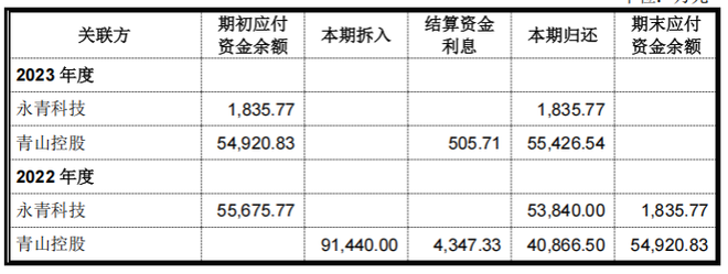 背靠"青山系",麦田能源获得了实打实的资金支持。麦田能源曾向永青科技和青山控股借款用于资金周转,公司解释称系前期资金实力有限,而生产采购、产品研发、日常运营等资金需求较大,存在一定资金缺口。2023年初,麦田能源对永青科技及青山控股的应付资金分别为1835.77万元、5.49亿元,在结算利息后于当年归还。