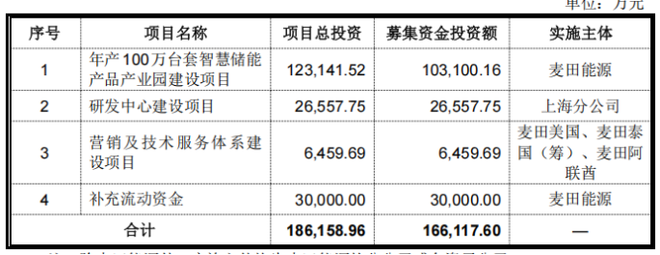 招股书显示,麦田能源此次IPO募资拟分别投向年产100万台套智慧储能产品产业园建设项目(下称智慧储能产品项目)、研发中心建设项目、营销及技术服务体系建设项目、补充流动资金,拟投入募资额分别为10.31亿元、2.66亿元、6459.69万元、3亿元。