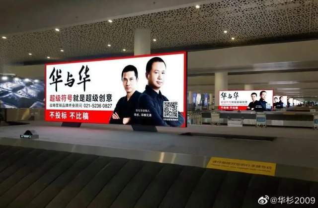 而且这套方法论,华杉、华楠兄弟自己也在用。高铁、飞机广告板上,兄弟俩双手交叉抱于胸前、注视前方。搭配“华与华,战略营销品牌终身顾问,超级符号就是超级创意”、“不投标、不比稿”等广告词,十几年不变。