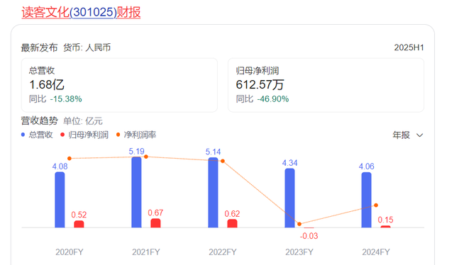 从上面的图可以看出,读客文化的业绩在2021年之后,呈现下滑的趋势,并且长期低迷。