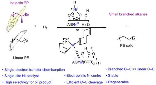 与传统的催化剂和回收工艺相比,该团队所用的镍基单点分子催化剂无需贵金属,不仅反应温度比常规工艺低约100摄氏度,氢气压力也减半,催化剂消耗量是传统方式的十分之一,而活性却提升了十倍。更难能可贵的是,即使废弃塑料中含有多达25%的PVC污染物,该催化剂依然表现出色,甚至反应效率更高,且可多次再生再用。