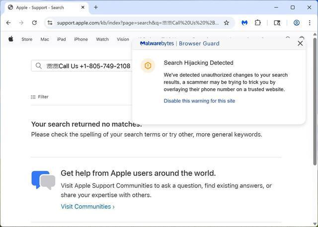 Malwarebytes表示,其浏览器防护扩展程序可以将此策略检测为搜索劫持并向用户发出警告。其他危险信号包括合法 URL 末尾出现电话号码、过度使用令人担忧的语言、使用“%20”等编码字符,以及在用户输入查询之前就显示结果的搜索页面。