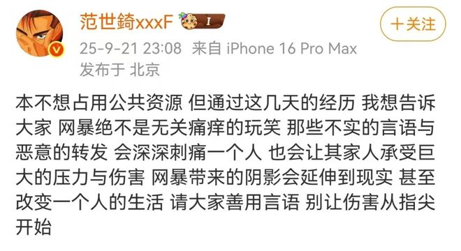 9月22日一早,“范世錡发文抵制网暴”的词条,冲上热搜。