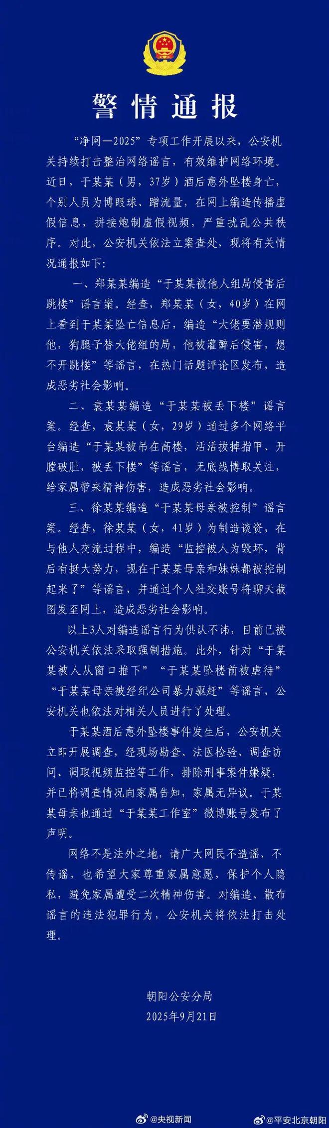 9月21日晚,警方查处涉于朦胧坠楼谣言后,演员范世錡在社交平台发文: