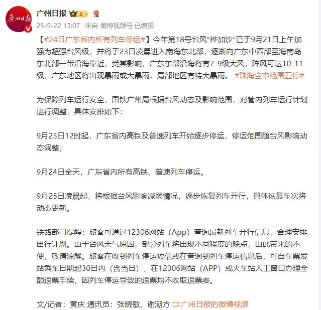 9月24日全天,广东省内所有高铁、普速列车停运。