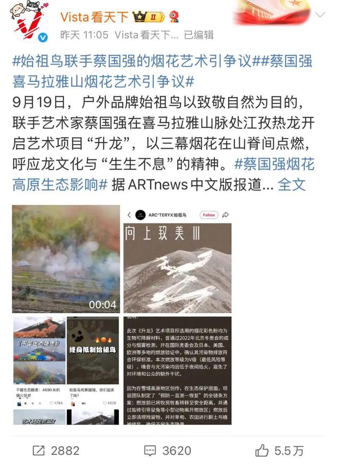 始祖鸟或许认为环保是做到位的。澎湃新闻曾指出,此次使用的烟花彩色粉均为生物可降解材料,确认其污染物排放符合环保标准。「环保烟花」是始祖鸟最大的底气,其活动合作方“悦游CNTraveler”在社交媒体上强调过一次,蔡国强也在直播里说起过一次。这篇文章已经被澎湃新闻删除。