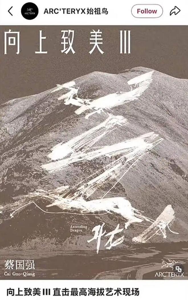 9月19日,知名户外品牌始祖鸟联合艺术家蔡国强在喜马拉雅山脉江孜热龙地区(海拔4690-5500米),策划了一场“向上致美”的艺术活动。主要活动内容是《升龙》烟花秀,在一处山脊上点燃三幕烟花,火焰从上往下引爆。澎湃新闻曾报道,这是想展现对天地宇宙的追问,和始祖鸟对自然的敬畏。