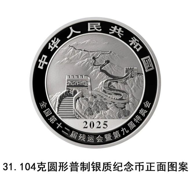 31.104克圆形银质纪念币正面图案为长城,并刊“全国第十二届残运会暨第九届特奥会”中文字样及国名、年号。