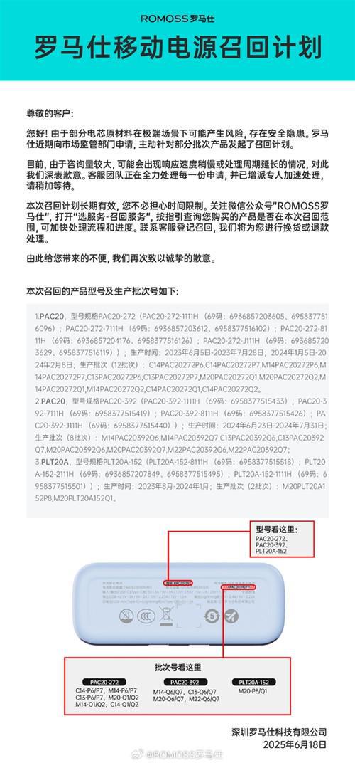 罗马仕启动最大规模召回:49万台产品存燃烧风险面对舆论压力,深圳罗马仕科技有限公司于本月18日宣布,即日起召回2023年6月5日至2024年7月31日期间生产的部分移动电源,涉及PAC20-272、PAC20-392、PLT20A-152三款型号,总量达491745台。召回公告称,问题产品因电芯原材料缺陷,“极少数在使用过程中可能过热,极端场景下存在燃烧风险”。值得注意的是,此次召回范围覆盖了引发航班事故的同款20000毫安时容量产品。