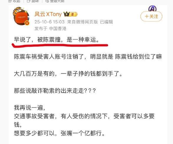 另有消息显示,10月6日,有微博用户发文称,“被陈震撞,是一种幸运。”9日,微博社区观察员官方账号发文称,经核实,所示违规用户@风云XTony 对交通事故进行营销炒作,通过恶意揣测事故双方来博取眼球,宣扬不良价值导向,因违反社区公约,目前已受到禁言处置,并扣除近期全部收益。