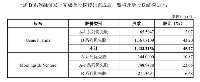 Genie Pharm是最早投资盟科药业的机构之一。在盟科药业2013年的B轮融资中,Genie Pharm就豪掷2000余万美元参与领投,并承接了A轮机构Devon Park的部分股票。虽然Genie Pharm后续再未追加投资,但却以大股东身份陪伴了盟科药业长达12年时间。