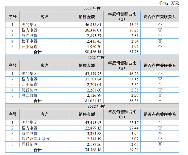 2022年至2024年,南特科技前五大客户销售收入占营业收入的比例分别高达89.20%、86.35%、 87.78%。其中,美的集团与格力电器的占比分别达79.61%、79.38%、80.71%,如此高的占比说是公司只给美的、格力“打工”也不为过。