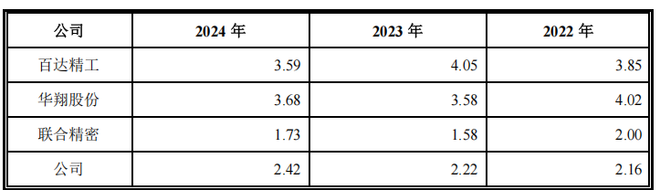从同行可比公司来看,百达精工2022年至2024年的应收账款周转率分别为3.85、4.05、3.59;华翔股份则分别为4.02、3.58、3.68。与南特科技应收账款周转率较为接近的是联合精密,为2.00、1.58、1.73,原因为二者下游客户较为重叠主要为美的集团、格力电器等压缩机生产商,也就是说,深度绑定美的与格力这样的大客户,公司的回款与周转都会被压制。