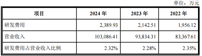 体现在研发层面,2022年至2024年,南特科技的研发费用分别为1956.12万元、2142.51万元、2389.93万元,占营收比分别为2.35%、2.28%、2.32%。