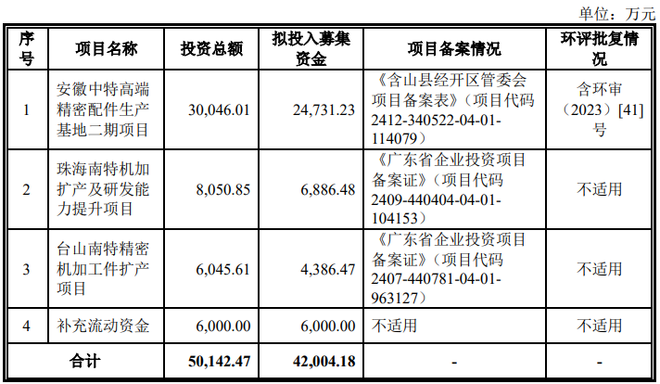 值得注意的是,在2024年的申报稿招股书中,南特科技计划募资4.2亿元,其中,安徽中特高端精密配件生产基地二期项目计划投入募集资金2.47亿元,珠海南特机加扩产及研发能力提升项目计划投入募集资金0.69亿元,台山南特精密机加工件扩产项目计划投入募集资金0.44亿元,另有0.6亿元用于补流。