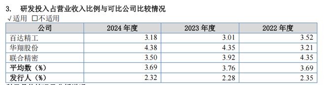 横向比较来看,百达精工、华翔股份、联合精密的研发占营收比均在3.65%以上,在该方面南特科技不及同行。