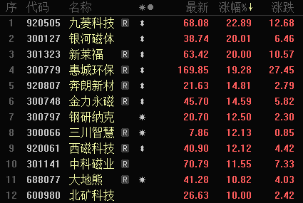 10月13日,稀土板块震荡拉升。截至中午收盘,稀土永磁概念板块指数大涨5.36%。个股方面,银河磁体(300127.SZ)、新莱福(301323.SZ)双双实现20CM涨停,金力永磁(300748.SZ)涨14.59%,钢研纳克(300797.SZ)涨12.50%。此外,北矿科技、华宏科技、安泰科技等多只个股均收获10CM涨停。