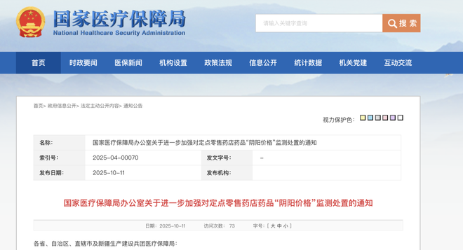 10月11日,据国家医保局网站消息,国家医保局日前发出通知,要求严肃查处定点零售药店药品“阴阳价格”问题,定点药店不得对医保参保人员实行不公平、歧视性价格。为进一步,国家医疗保障局办公室做出了相关要求:一,高度关注定点药店“阴阳价格”问题线索;二,严肃核查处置“阴阳价格”问题;三、做好常态化监测治理。