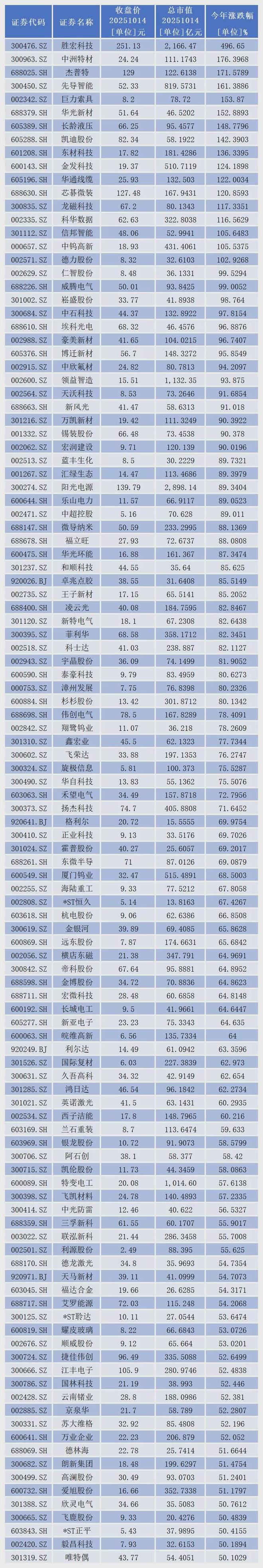 从二级市场表现看,今年以来,429家上市公司股价出现上涨,其中,胜宏科技(300476.SZ)、中洲特材(300963.SZ)、杰普特(688025.SH)、先导智能(300450.SZ)、巨力索具(002342.SZ)、华光新材(688379.SH)、长龄液压(605389.SH)、凯迪股份(605288.SH)、东材科技(601208.SH)、金发科技(600143.SH)、华通线缆(605196.SH)、芯碁微装(688630.SH)、龙磁科技(300835.SZ)、科华数据(002335.SZ)、信邦智能(301112.SZ)、中钨高新(000657.SZ)、德力股份(002571.SZ)17家上市公司股价成功实现翻倍。