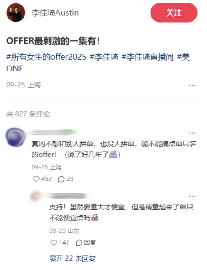 按升囤、按升卖、按百瓶清货,在这场“想要承包你一年用量”乃至你一家用量的双11大促里,李佳琦直播间虽不是山姆,但在走量上对标山姆。他在综艺offer上线的第一天高兴地在小红书宣布“OFFER最刺激的一集有”,热评第一却是:真的不想和别人拼单,也没人拼单。