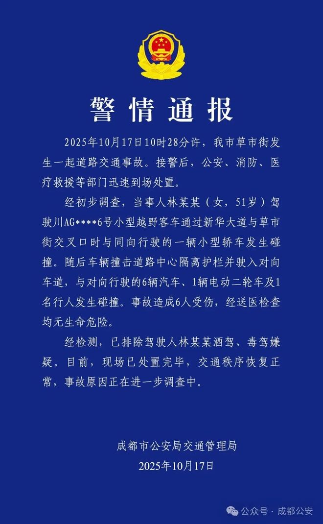10月17日,成都市公安局交通管理局发布警情通报:10月17日10时28分许,成都市草市街发生一起道路交通事故。接警后,公安、消防、医疗救援等部门迅速到场处置。经初步调查,当事人林某某(女,51岁)驾驶川AG****6号小型越野客车通过新华大道与草市街交叉口时与同向行驶的一辆小型轿车发生碰撞。随后车辆撞击道路中心隔离护栏并驶入对向车道,与对向行驶的6辆汽车、1辆电动二轮车及1名行人发生碰撞。事故造成6人受伤,经送医检查均无生命危险。经检测,已排除驾驶人林某某酒驾、毒驾嫌疑。目前,现场已处置完毕,交通秩序恢复正常,事故原因正在进一步调查中。