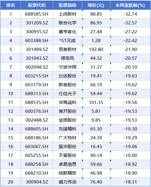 本周个股跌幅榜前五位分别是上纬新材、联合化学、嘉亨家化、*ST元成、思泉新材,累计跌幅分别为32.74%、32.57%、27.22%、22.42%、21.90%。
