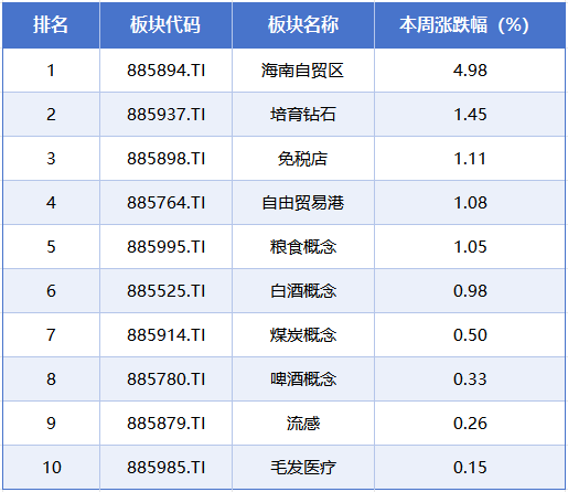 板块方面,本周涨幅居前的概念板块分别是海南自贸区、培育钻石、免税店、自由贸易港、粮食概念,累计涨幅分别为4.98%、1.45%、1.11%、1.08%、1.05%。
